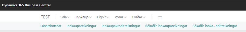 Í aðalvalmynd Samningakerfis er mappan Innkaup en þar er hægt að fara beint inn á lánardrottnaspjald, reikninga/kreditreikninga sem hafa verið myndaðir á lánardrottna en ekki búið að bóka og að lokum er hægt að skoða bókaða reikninga/kreditreikninga.