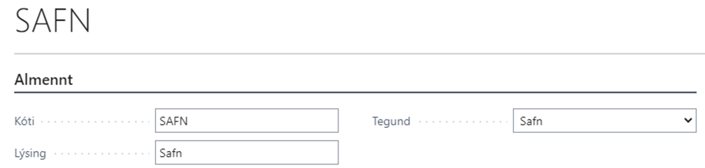 Tegund | Tegund safns. Tegundin getur verið Safn, Hámark/lágmark eða Afsláttur. Tegundin Safn er notuð fyrir almennt safn og reiknireglur fyrir útreikning. Möguleiki er að setja upp safn fyrir hámarks-/lágmarksgjald eða afslátt en það er gert ef slíkt er ekki föst tala heldur útreiknuð upphæð. |