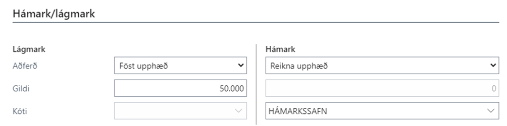 Kóti | Þessi reitur opnast ef valið er Reikna upphæð / Reikna magn í reitnum Aðferð og er hér vísað í hámarks/lágmarks safn sem sett hefur verið upp fyrir útreikning á hámarki/lágmarki. |
