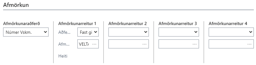 Afmörkunarreitur 1/2/3/4 | Hér er sett Aðferð og hægt að velja um að afmarka á Fast gildi, Vídd eða ákveðinn Reit. Í reitinn Afmörkun er sett fasta gildið, víddin reitinn sem afmarka á. |