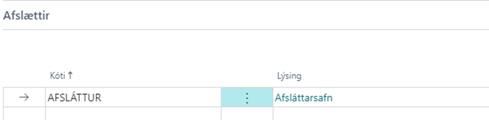 Aðferð | Valmöguleikar eru Reikna upphæð, Föst upphæð, Reikna magn og Fast magn. Ef valið er Reikna upphæð eða Reikna magn er sett upp safn með tegundinni Hámark/lágmark þar sem tilgreint er hvernig upphæð/magn skuli vera reiknað út og vísað í það safn í reitnum Kóti. Ef valið er Föst upphæð eða Fast magn er upphæðin sett í reitinn Gildi. |