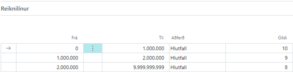 Hægt er að setja upp mismunandi gildi fyrir mismunandi upphæðir og eru þá hér settar upp línur þar sem tilgreint er frá og til upphæð og svo gildi, annað hvort hlutfall eða föst upphæð.