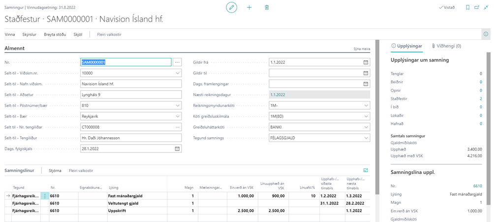 Reikningsfæra - Hér birtist sjálfgefið upplýsingar um viðskiptamann sem er skráður í haus samnings. Ef annar aðili á að fá reikninginn, þá er það skráð hér.