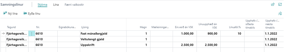 Upphafs-/lokadags. næsta tímabils | Dagsetningin erfist af upplýsingum í Almennt flipanum eða úr línunni fyrir ofan, mismunandi eftir uppsetningu. Hægt er að breyta dagsetningunni fyrir línu/r ef þörf er á. Í reikningamyndun er afmarkað á þessa dagsetningu. |