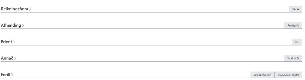 Fyrir neðan samningslínur eru nokkrir kaflar sem heita Reikningsfæra, Afhending, Erlent, Annað og Ferill.