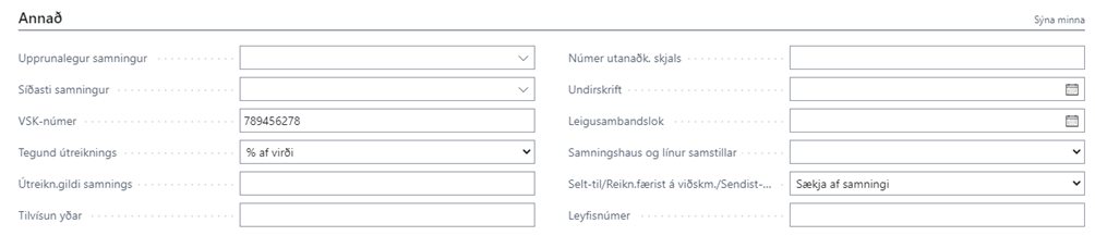 Upphafs-/lokadags. síðasta tímabils | Dagsetningin í þessum reit segir til um fyrir hvaða tímabil var síðast reikningsfært fyrir. Dagsetningin uppfærist sjálfkrafa þegar búið er að mynda og bóka reikninga í samningakerfinu. |