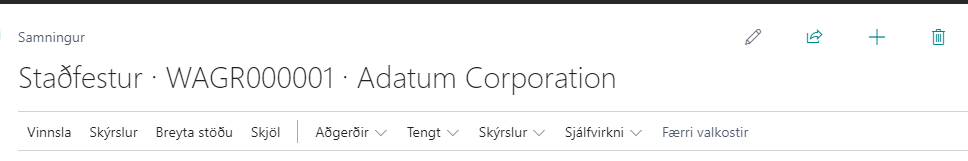 Í aðgerðastiku er hægt að vinna með samning, breyta stöðu hans, fletta upp bókuðum reikningum o.fl.