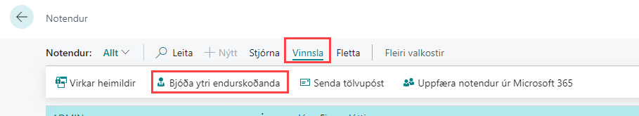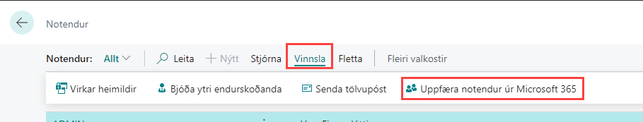 Þar er síðan valin aðgerðin Vinnsla – Uppfæra notendur úr Microsoft 365. Við það stofnast notandinn á lista yfir Business Central notendur. Á notandaspjaldi er svo hægt að stilla hvaða heimildir sá notandi á að hafa og inn í hvaða fyrirtæki.