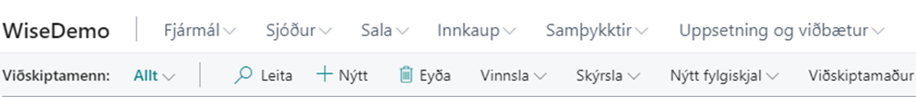 Í aðgerðarstikunni eru sýnilegar flestar þær aðgerðir sem eru á færi notandans hverju sinni. Valmöguleikar borðans breytast eftir því hvað er verið að vinna við. Dæmi um það eru að þegar notandi er inni í Viðskiptamenn býðst honum velja hnappa eins og Nýtt, Eyða, Vinnsla, o.s.frv.