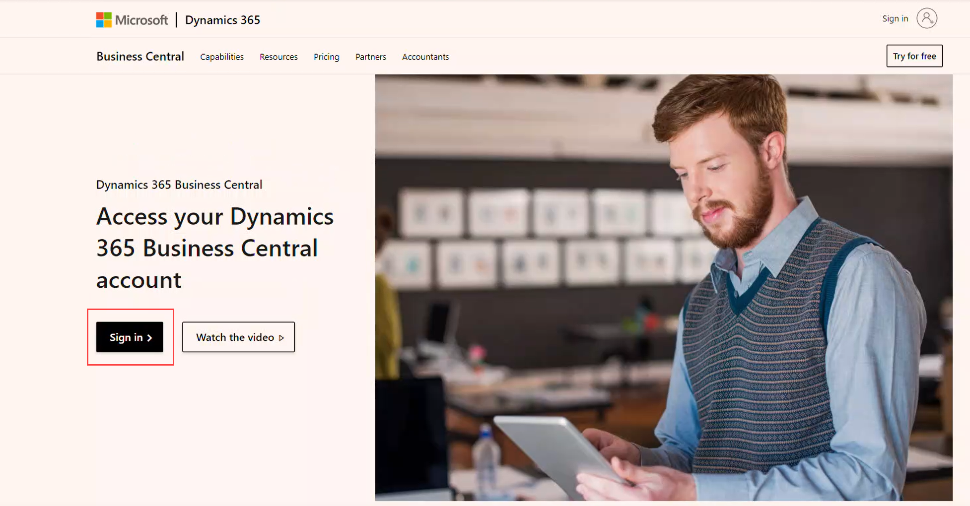 Byrja þarf á að fara inn á https://businesscentral.dynamics.com/ og smellir þar á Sign in.