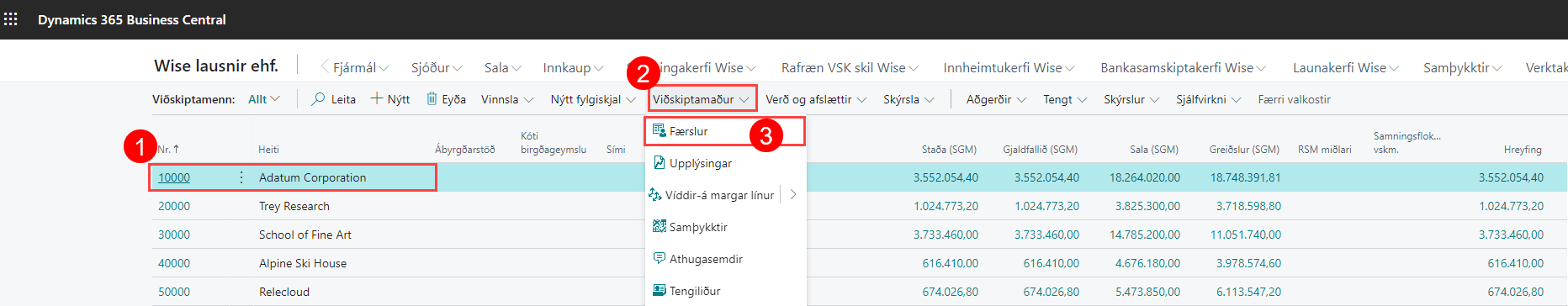 Velur þann viðskiptamann sem á að jafna, velja svo viðskiptamaður uppi í aðgerðarstikunni og smella svo á færslur.