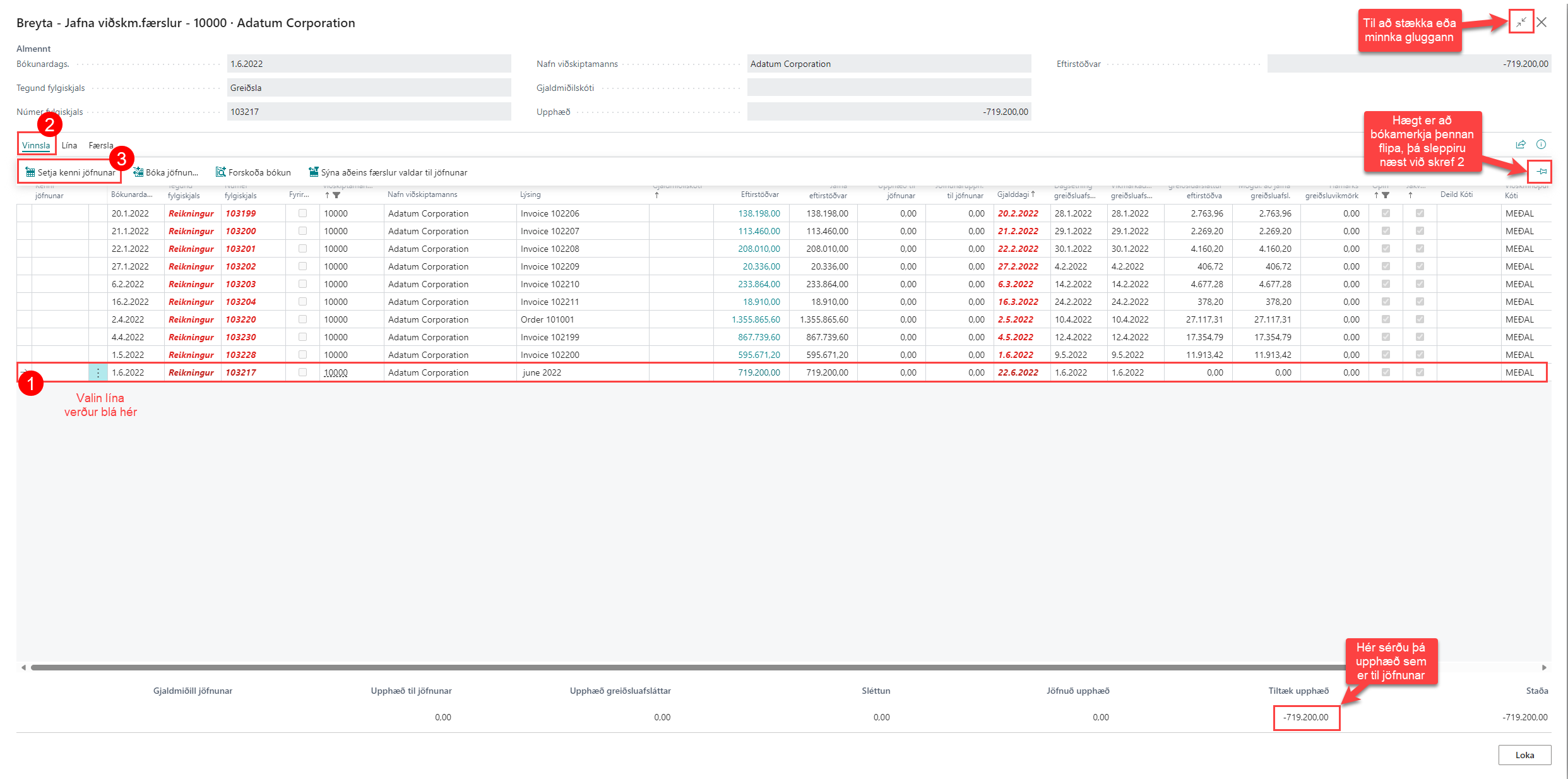 Flýtileiðin fyrir þessa aðgerð er að velja þann viðskiptamann sem á að jafna og smella svo á CTRL+F7, þá opnast allar færslur valins viðskiptamanns.