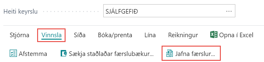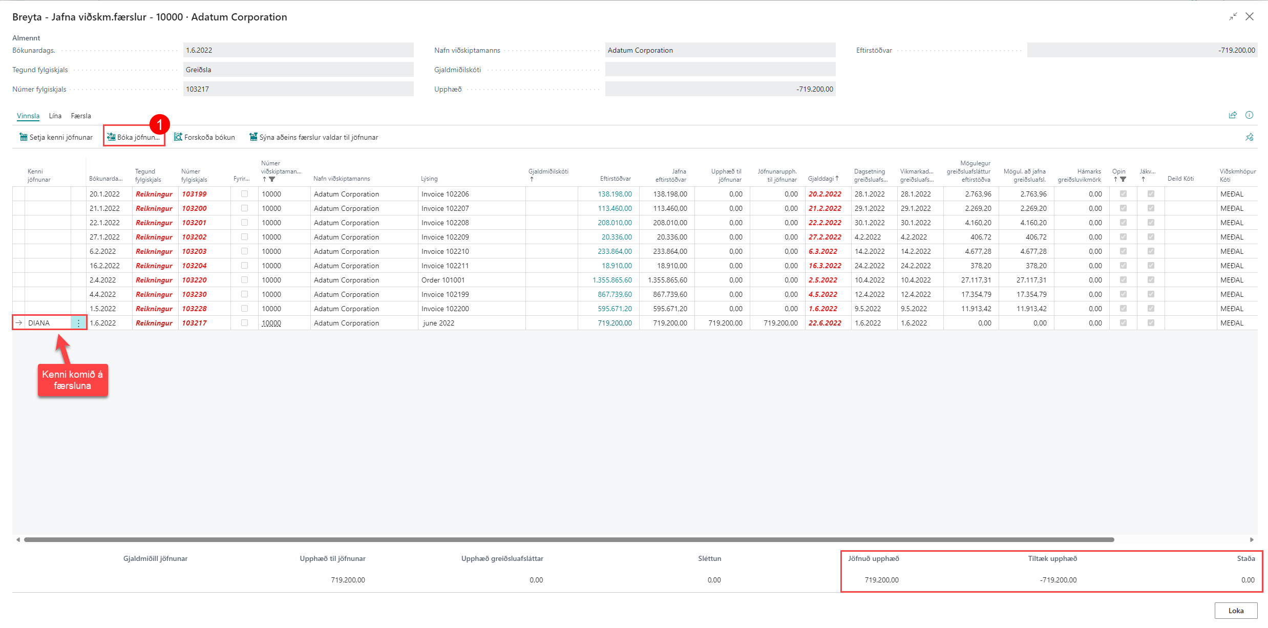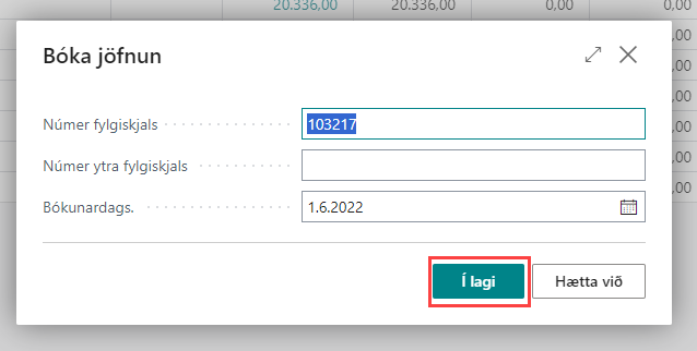 Þá sést hér að komið er kenni á færsluna og þá er hægt að smella á Bóka jöfnun