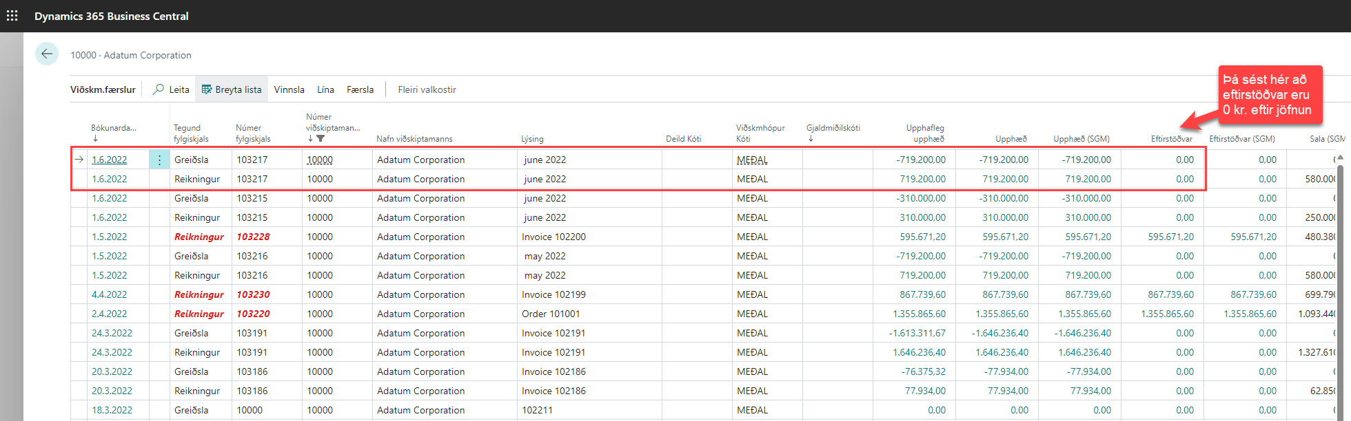 Hér má sjá að jöfnun hefur tekist þar sem eftirstöðvar eru orðnar 0,00