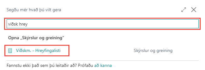 Í dæminu hér að neðan er slegið inn leitarorðið viðsk hrey og þá verða sýnilegir þeir gluggar og skýrslur sem innihalda leitarorðið. Notandinn getur annað hvort smellt á rétt atriði með músinni eða notað örvatakkana til að velja það sem hann vill opna og smella svo á Enter takkann til að opna viðkomandi atriði.