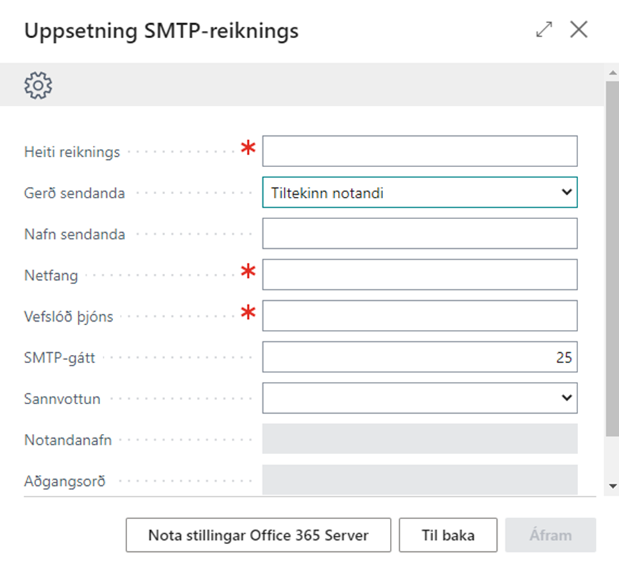 Heiti þjónustuaðila | Vefslóð þjóns | SMTP-gátt |