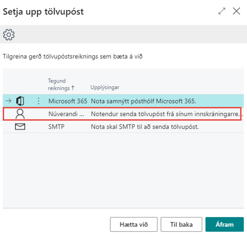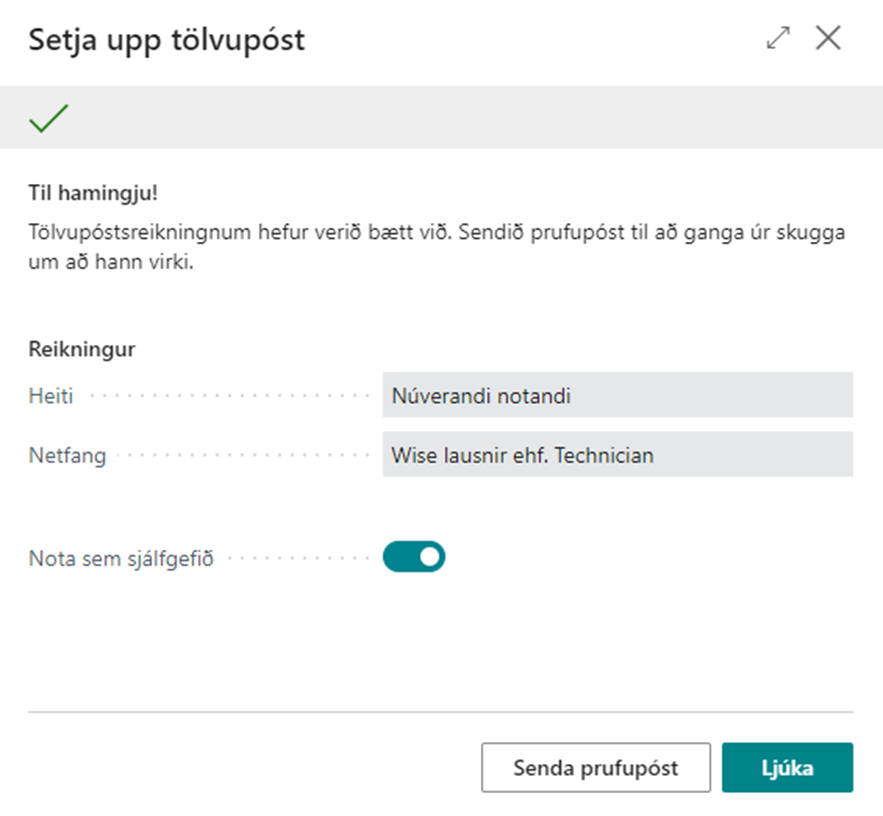 Til hamingju! Tölvupóstsreikningnum hefur verið bætt við. Sendið prufupóst til að ganga úr skugga um að hann virki.