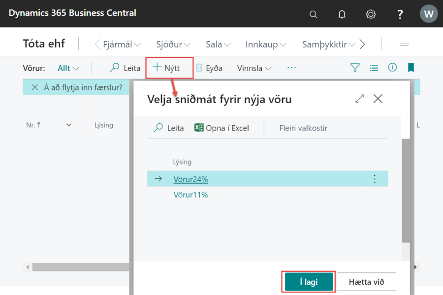 Þar er valið sniðmát fyrir vöruna, hvort hún eigi að vera með 11% eða 24% vörubókunarflokkum. Tvísmellið á sniðmátið og þá kemur upp vöruspjald.
