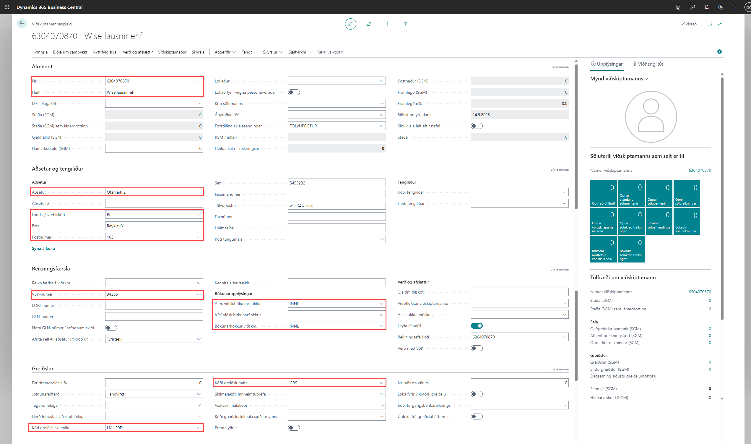 Þegar það er gert þá kemur fyrirspurn um hvort þú viljir fletta kennitölunni upp í Þjóðskrá ef þú hefur gert samning um þjóðskrártengingu hjá Wise. Þar er valið Já ef viðskiptamaðurinn er með íslenska kennitölu, annars er valið Nei. Ef valið er Já þá fyllast út helstu upplýsingar sjálfkrafa.