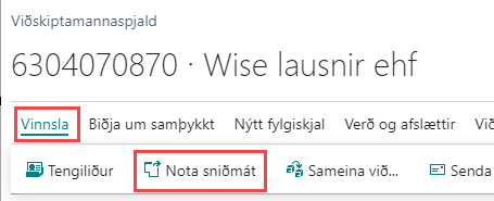 Eftir að kennitalan hefur verið slegin inn er næst farið í Vinnsla og smellt á Nota sniðmát. Mælt er með því að nota sniðmátin sem sett hafa verið upp í kerfinu. Eitt sniðmát er til fyrir innlenda viðskiptamenn og annað fyrir erlenda. Við það að velja sniðmátið munu allar helstu upplýsingar um bókunarflokka o.fl. fyllast út sjálfkrafa.