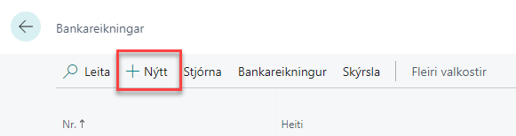 Til að setja upp bankareikning er farið í Bankareikningar í mitt hlutverk og valin aðgerðin Nýtt.