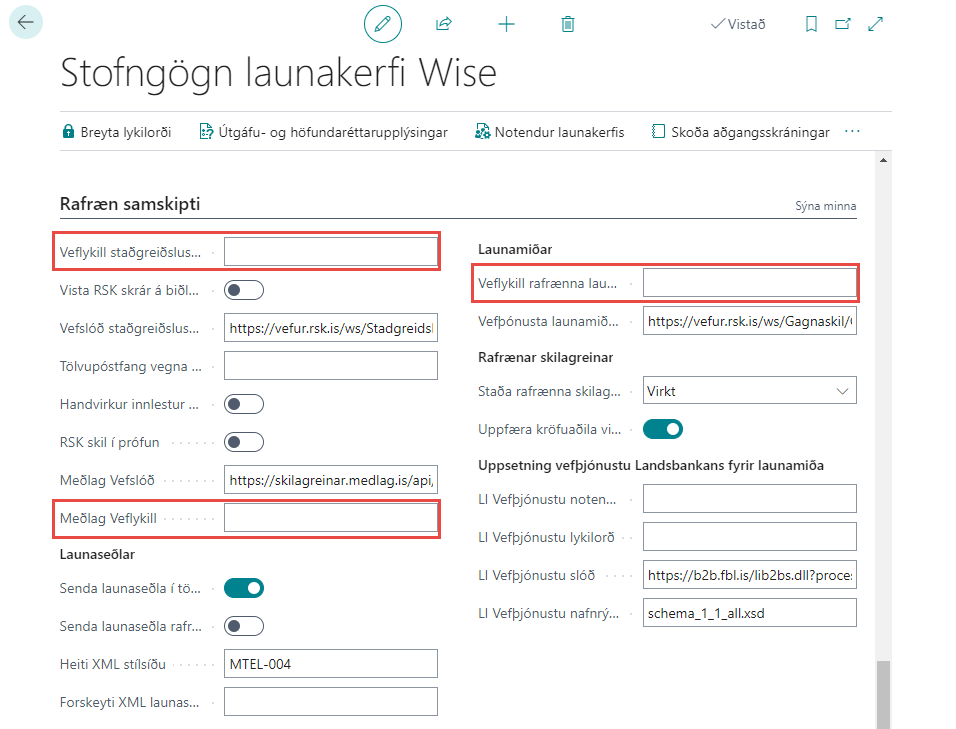 Setja þarf inn veflykil fyrir rafræn skil í Stofngögn Launakerfis Wise. Farið er í gegn um það á myndbandinu hér fyrir neðan.