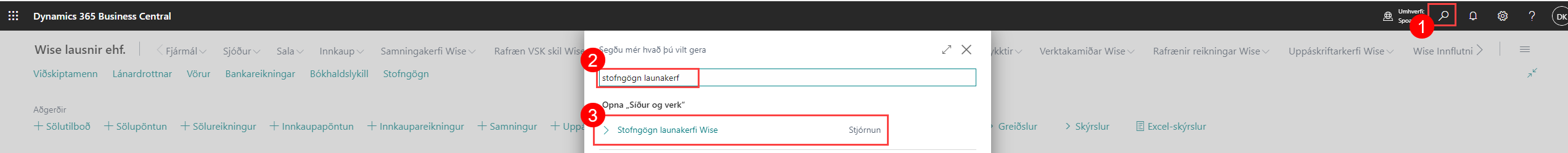 Farið í leitina uppi í hægra horninu eða Alt+Q og ritið stofngögn launakerfi, smelllið þar á Stofngögn launakerfi Wise