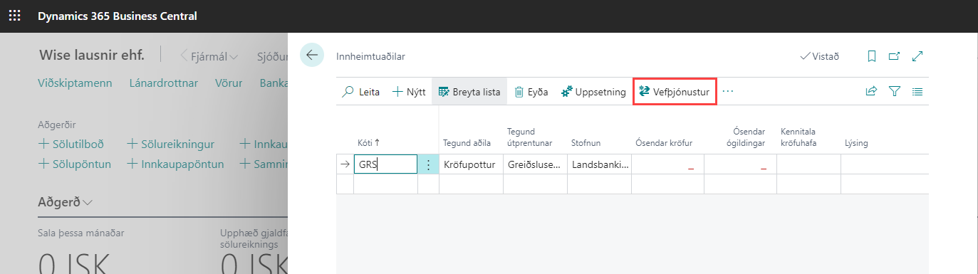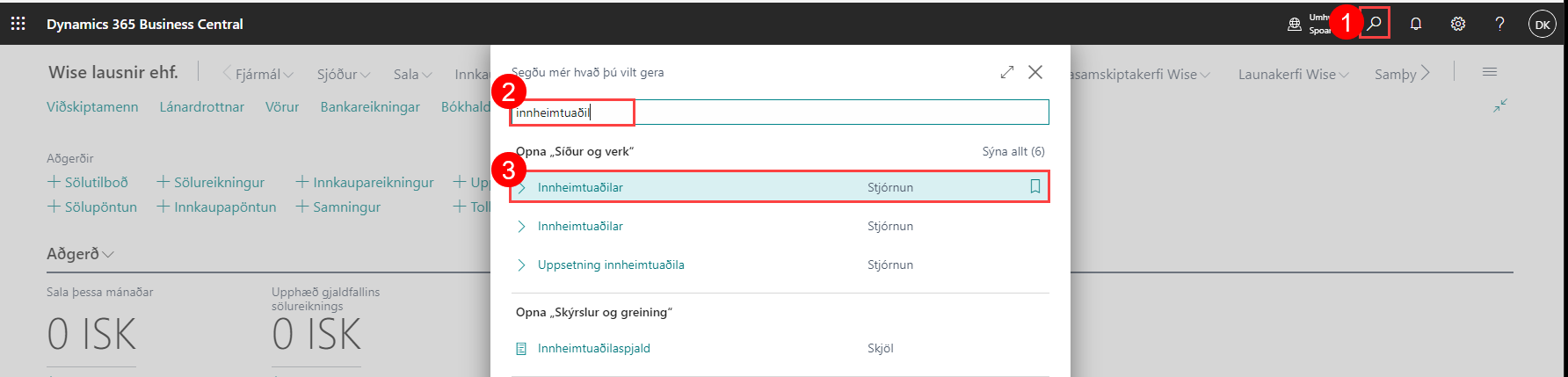 Byrjað er á að fara í leitina uppi í hægra horninu eða Alt+Q og ritað innheimtuaðilar, smellt er á innheimtuaðilar.