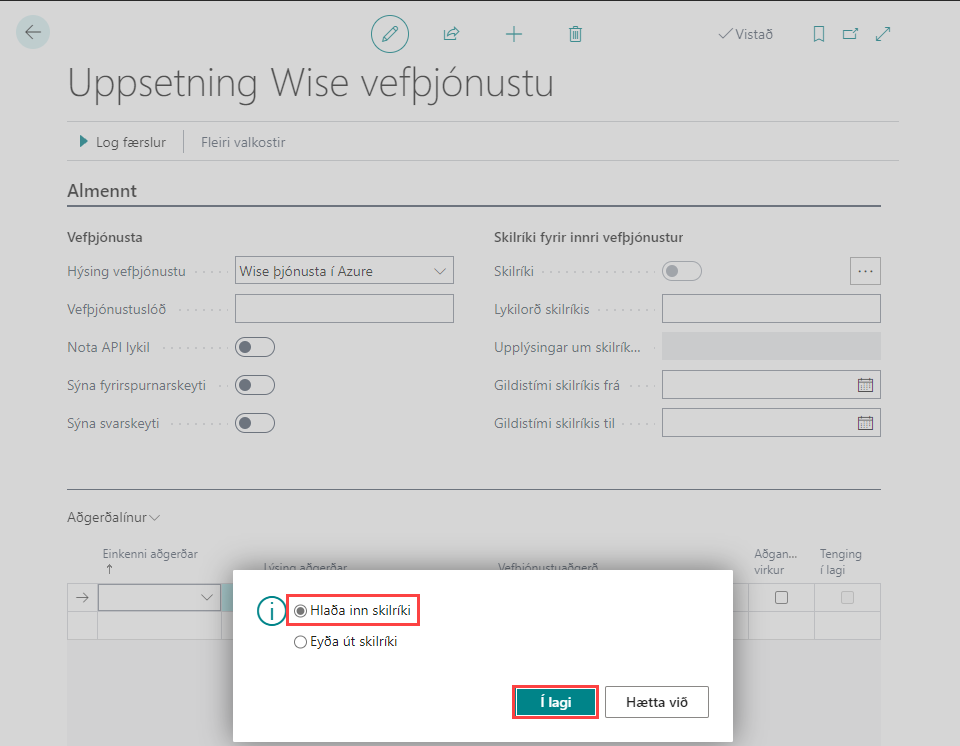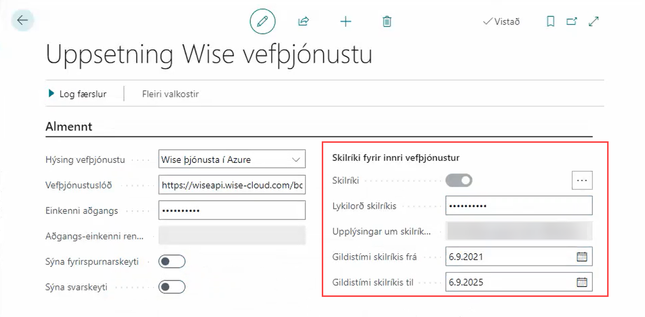 Setja þarf inn búnaðarskilríki fyrirtækis undir Uppsetning Wise Vefþjónustu í Innheimtukerfi Wise.