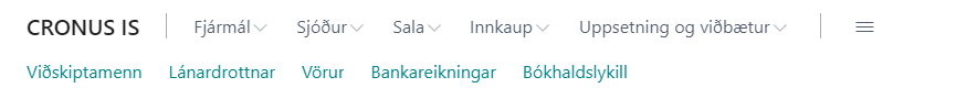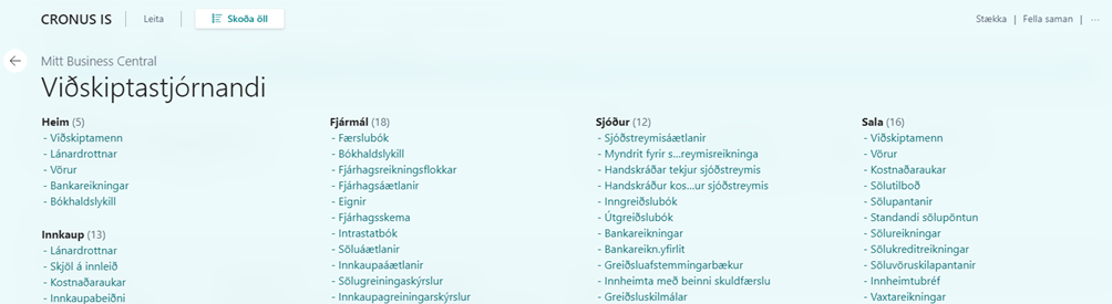 Fyrir neðan efstu stikuna eru síðan þeir listar sem aðgengilegir eru í hlutverkinu, svo sem viðskiptamenn, lánardrottnar, vörur og fleiri listar sem eru algengir fyrir hlutverk notandans. Efst til hægri er hægt að smella á þrjú strik þar sem hægt er að sjá yfirlit yfir allar aðgerðir hlutverksins.