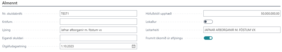 Höfuðstóll upphæð** | Nafnverð bréfsins er sett inn hér. Þessi upphæð er grunnurinn í stofnun afborgana fyrir bréfið. Nafnverðsupphæðin er slegin inn í þeirri mynt sem bréfið er í. Þegar verið er að taka skuldabréfakerfið í notkun verður að gæta þess að þegar nafnverð bréfs er slegið inn á miðjum lánstíma að notast sé við eftirstöðvar nafnverðs fyrir næstu greiðslu. Ef um verðtryggt lán er að ræða verður að slá inn upphæðina án verðbóta. |