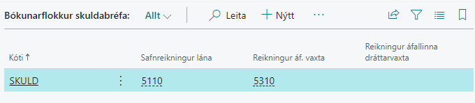 Þessi liður felur í sér hvar skuldabréf eru færð til skuldar eða eignar. Taflan er notuð til að setja upp einn eða fleiri bókunarflokka sem vísa á fjárhagslykla. Hvert bréf er síðan tengt ákveðnum bókunarflokki.