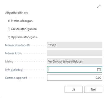 Nýr gjalddagi er stofnaður, slá þarf inn dagsetninguna og upphæð greiðslunnar. Smellt er á Já til að stofna afborgunina. Mikilvægt að bóka þessa nýju afborgun áður en allar afborganir bréfsins eru uppfærðar.