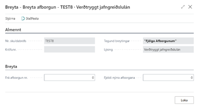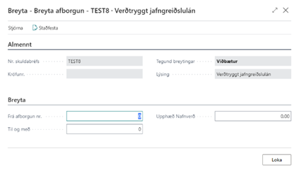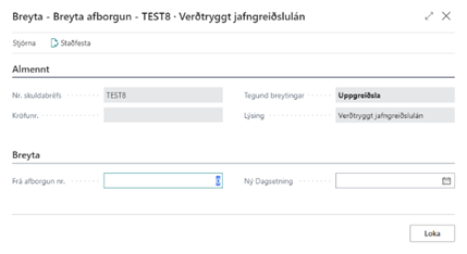 Í Frá afborgun er valin síðasta afborgun á bréfinu og svo sleginn inn fjöldi nýrra afborgana. Mikilvægt að smella á Staðfesta til að framkvæma breytinguna. Þá kemur upp gluggi þar sem staðfesta þarf að breytingin verði gerð og svo smellt á Í lagi til að loka glugganum.