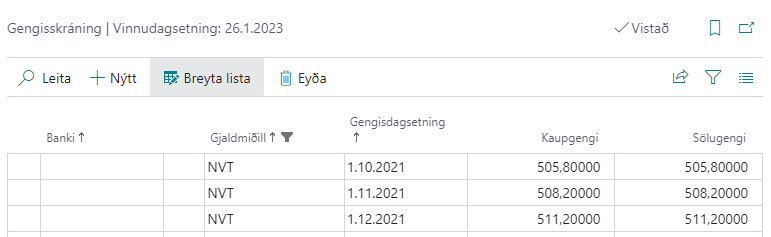 Fyrir hvern gjaldmiðil þarf að skilgreina gengisdaga, það er gert með því að velja hnappinn Gengi.
