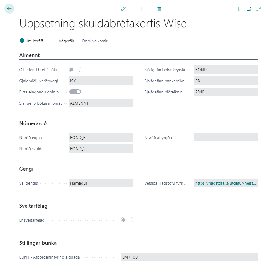 Sjálfgefið bókarsniðmát | Tilgreinir sjálfgefið færslubókarsniðmát fyrir skuldabréfavinnslu, svo sem höfuðstól, afborganir o.s.frv. |