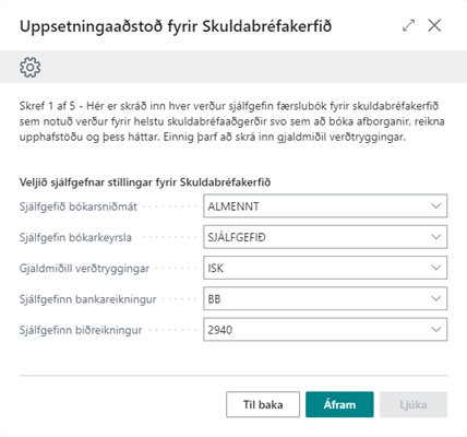 Skref 1 af 5: Hér þarf að velja þá færslubók sem þú vilt að kerfið noti. Allar færslur sem kerfið myndar sjálfkrafa munu fara í þessa færslubók.