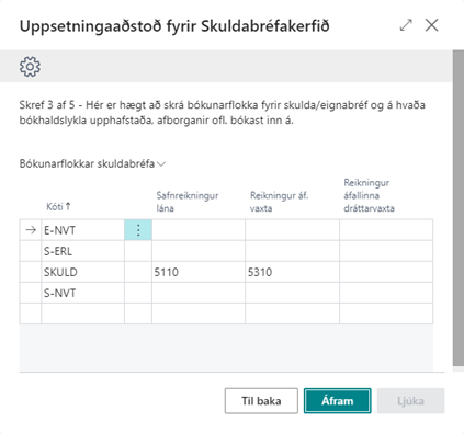 Skref 3 af 5: Hér þarf að slá inn fjárhagslykla fyrir bókunarflokka skuldabréfa sem voru stofnaðir skv. vali í síðasta skrefi.