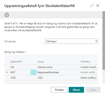 Skref 5 af 5: Hér valið hvort nota eigi gengistöflu Business Central kerfisins eða stofna eigi sérstaka gengistöflu fyrir skuldabréfakerfið. Fjárhagur er sjálfgefið og ef því er ekki breytt þarf ekki að gera neitt nema smella á Áfram.
