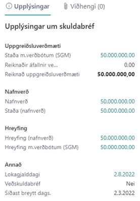 Nafnverð | Sýnir upphaflegt nafnverð bréfsins reiknað upp úr bókuðum höfuðstólsfærslum á bréfinu. |