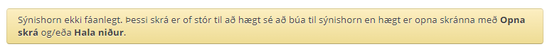 Bætt villumeðhöndlun við forkoðun á stórum skrám. Áður voru að birtast villur í þeim tilfellum þegar skrár voru of stórar til að meðhöndla með forskoðun þó svo að ekkert væri að skjalinu, það þurfti bara að opna það til að sjá innihaldið. Nú koma sérstök villuskilaboð sem gefa til kynna að skráin sé stór og ekki hægt að útbúa forskoðun á skjalið.
