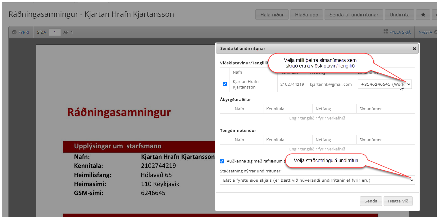 Hægt er að flýta fyrir við rafræna undirritun með því að setja sjálfgefið símanúmer við undirritun í stillingum notanda og bætt við villuprófun (e.data validation) á skráningu símanúmer. Hér er átt við undirritun sem gerð er beint á skjal í CoreData (ekki senda til undirritunar).
