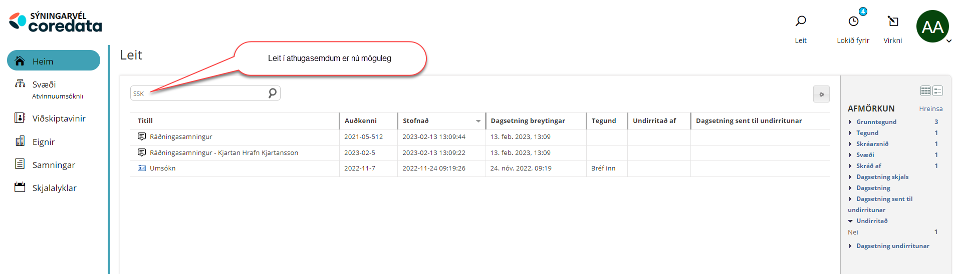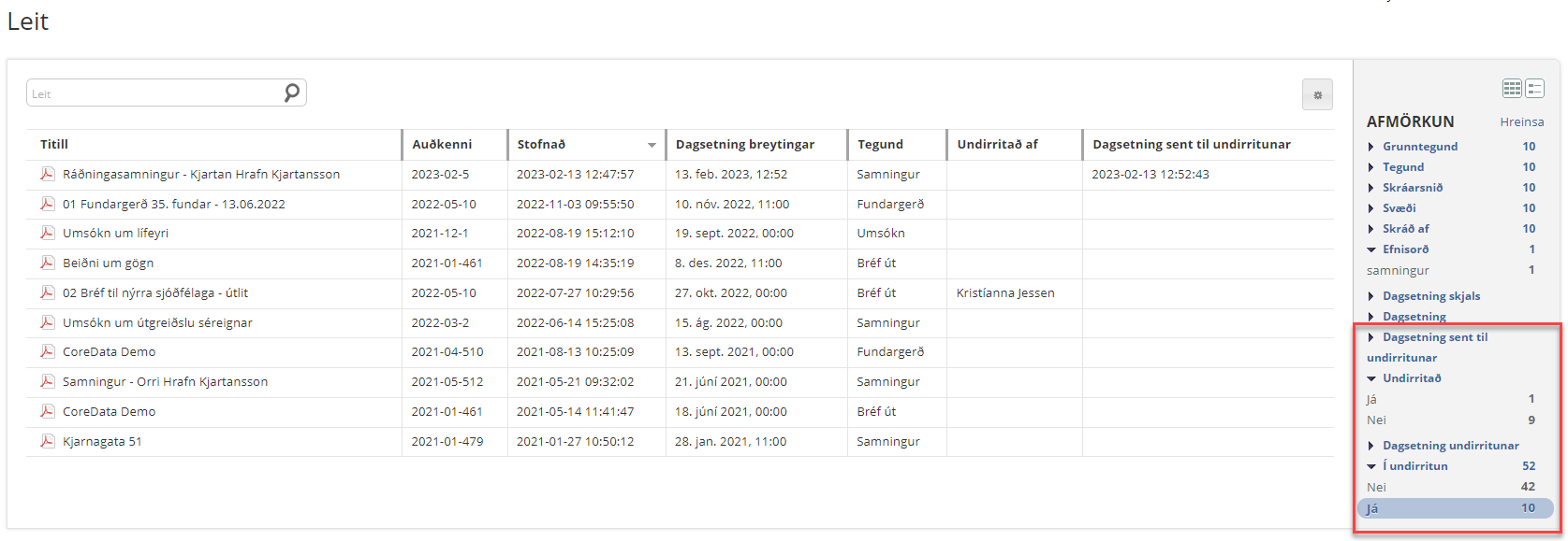 Nú er hægt að bæta við stóru leitina þannig að notandi geti fundið þau skjöl sem hafa verið send til undirritunar og eru ennþá í undirritunarferli. Hægt er að leita að dagsetningum skjala sem hafa verið send í undirritun og hvenær þau voru undirrituð. Einnig er hægt að leita að þeim skjölum sem eru með undirritun. Þetta gerir notendum kleift að ná betri yfirsýn yfir þau skjöl sem eru í undirritunarferli.