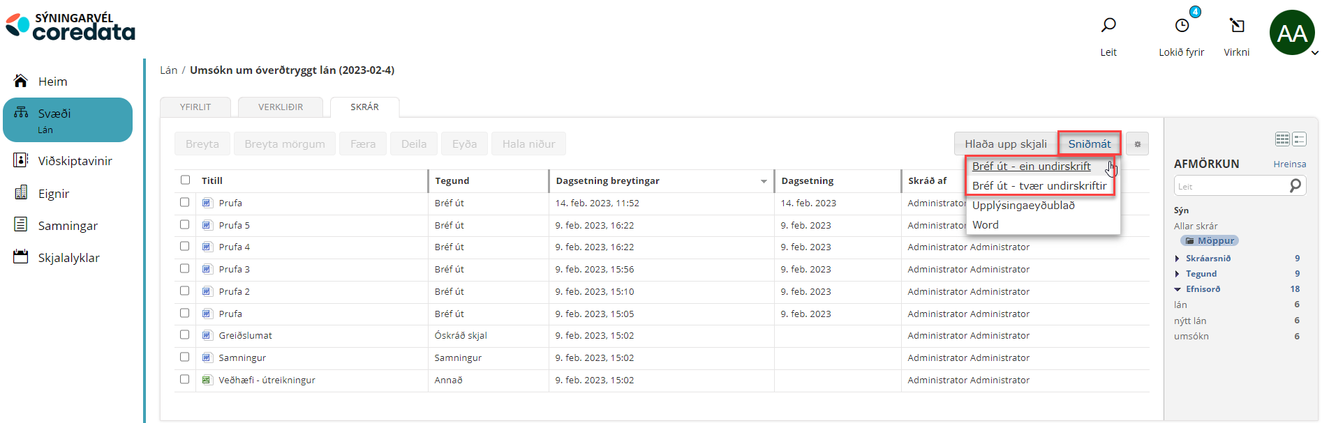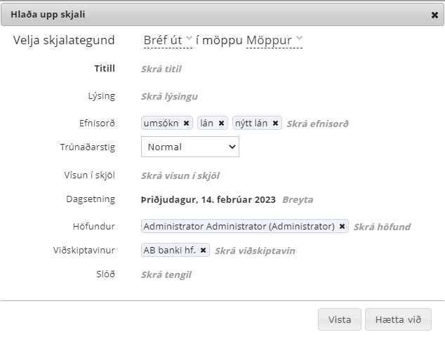 Notandi velur sniðmát (sem skilgreint er sem dynamic template í CoreAdmin) og við það kemur upp skjámynd fyrir lýsigögn viðkomandi skjals (sjá almennar notendaleiðbeiningar og leiðbeiningar fyrir CoreAdmin).