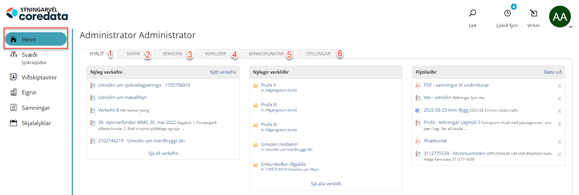 Í yfirliti Heim birtast Nýleg verkefni, Nýlegir verkliðir og Flýtileiðir sem tengjast innskráðum notanda.