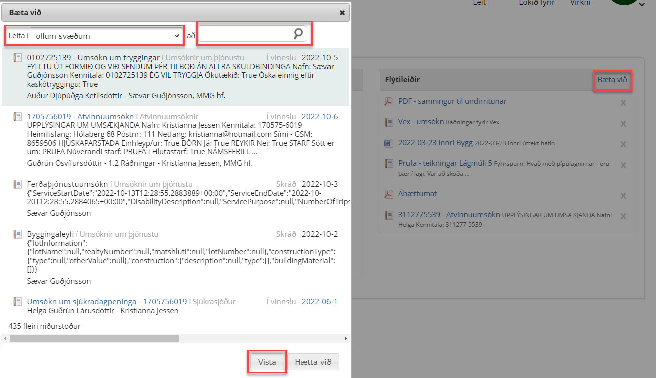 Til að velja er smellt á viðkomandi verkefni eða skjal og síðan á Vista neðst í glugganum.