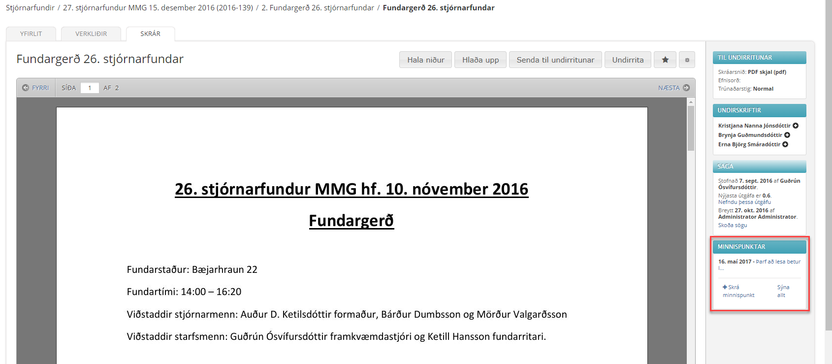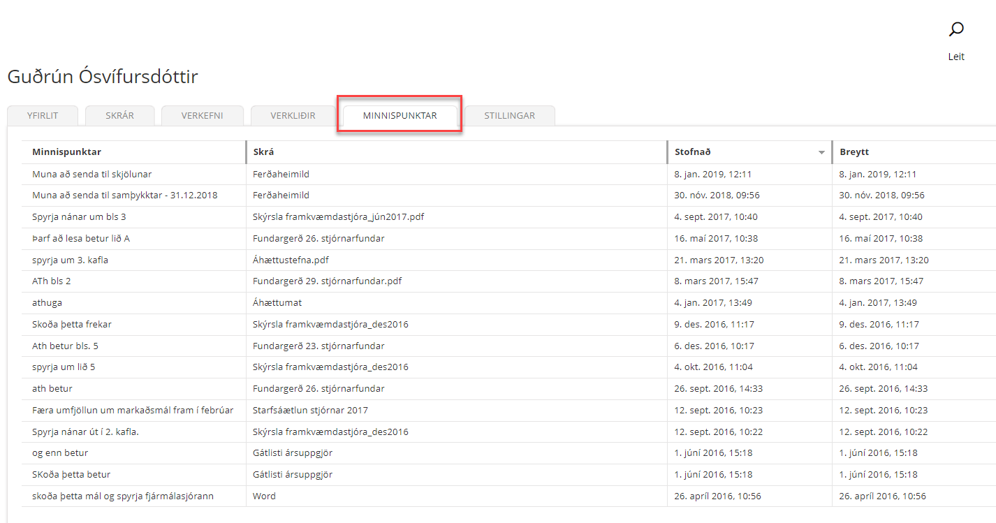 Býður notendum upp á að gera minnispunkta við skjöl í kerfinu sem eru eingöngu fyrir notandann sjálfan, það er minnispunktarnir birtast ekki öðrum notendum í kerfinu. Í þessum flipa er listi af öllum minnispunktum sem notandinn hefur gert.