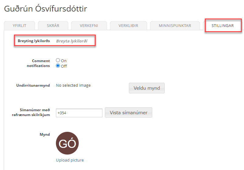 Hér er sett inn mynd af notanda. Ef engin mynd er valin, eru upphafsstafir notanda birtir.