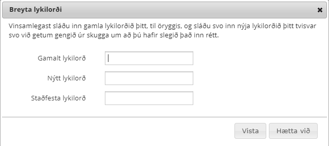 Í gluggann þarf að skrifa inn gamla lykilorðið í efsta reitinn, skrifið því næst nýtt lykilorð í mið reitinn og staðfestið lykilorð í þeim neðsta. Smellið á Vista að því loknu. Við næstu innskráningu í kerfið þarf að skrá nýja lykilorðið.