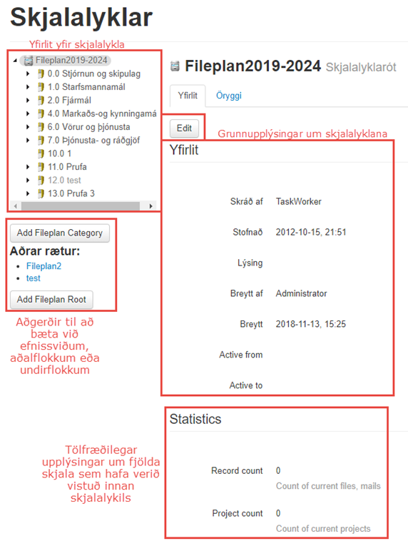 Upphafssíðan veitir yfirsýn yfir gildandi skjalaflokkunarkerfi auk aðgerða til þess að breyta og viðhalda flokkunarkerfinu.